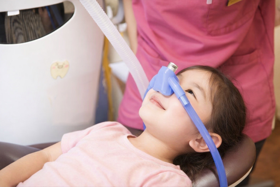歯医者さんが怖くて泣いてしまうお子さまには、ご希望に応じて笑気麻酔 (笑気ガス吸入鎮静法) を用い、安心して治療できる環境を整えています。